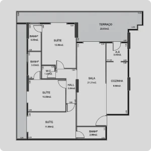 O projeto une design contemporâneo e funcionalidade, com salas amplas integradas ao jantar, varandas gourmet com churrasqueira a carvão com duto e acabamentos de alto padrão.